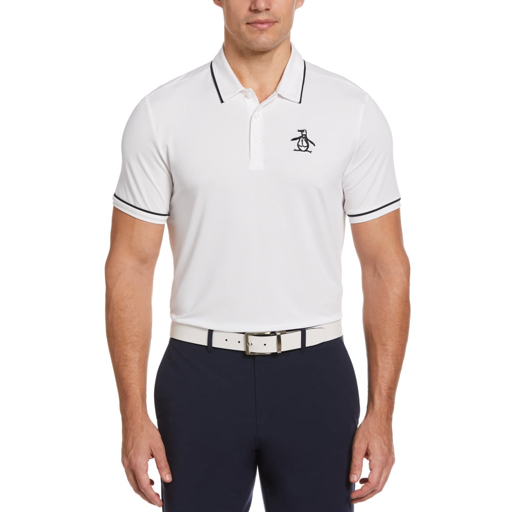 Pete goes big on this versatile men’s golf shirt from Original Penguin. The lightweight single knit fabric is quick-drying and enhanced with stretch for flexible comfort, on or off the course. Contrast tipping at the collar and cuffs complements the oversized Pete logo at the left chest for a bold, contemporary look. Featuring 88% recycled polyester content, this short sleeve golf polo is a sustainable style option you can feel good about.