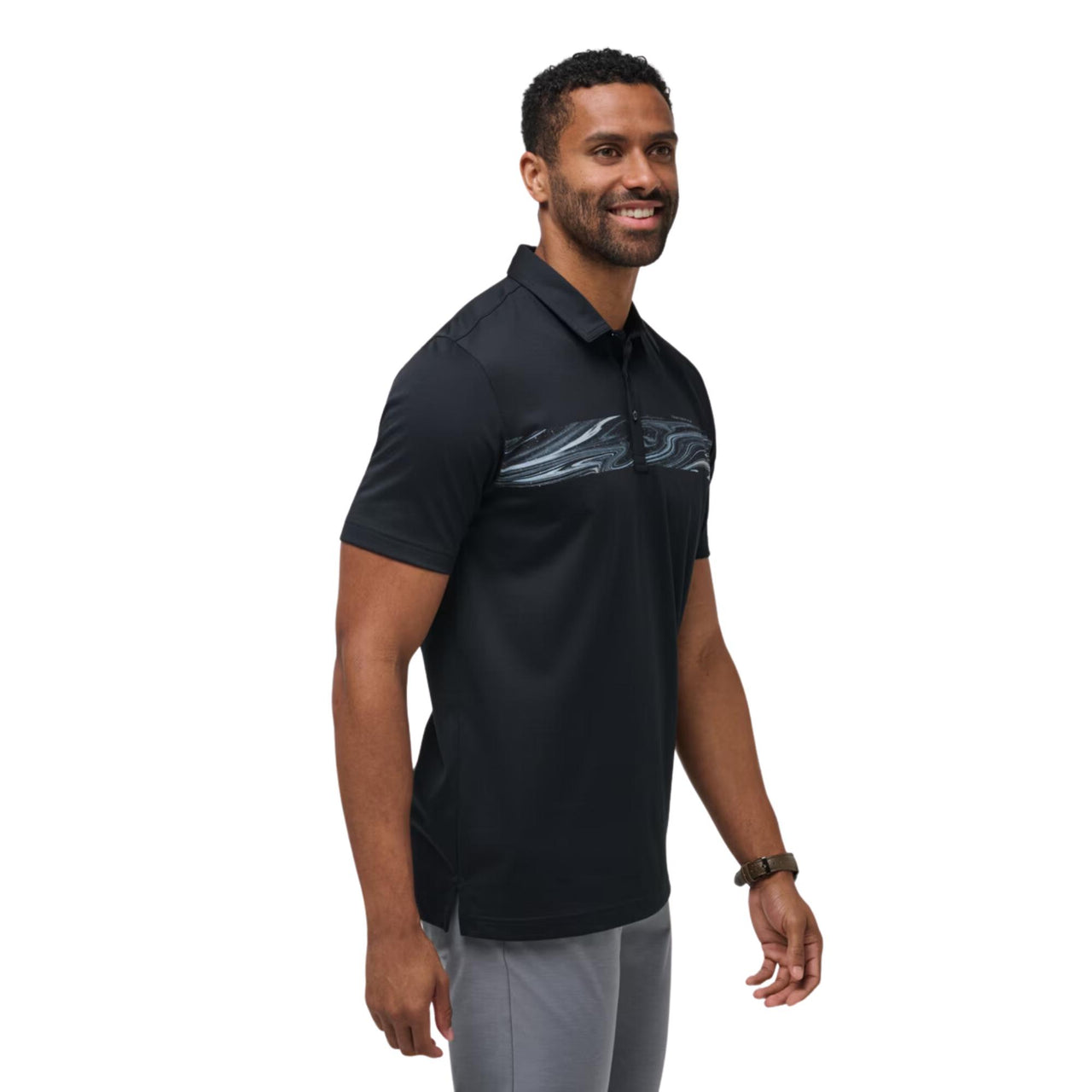Sail fearlessly for DARK WATERS in a polo fit for any adventure. With a chest stripe featuring a marbled, abstract water motif, savor the journey, the destination, and every detour along the way.